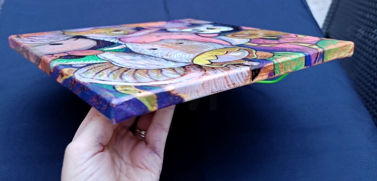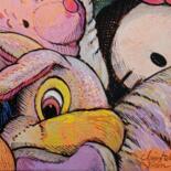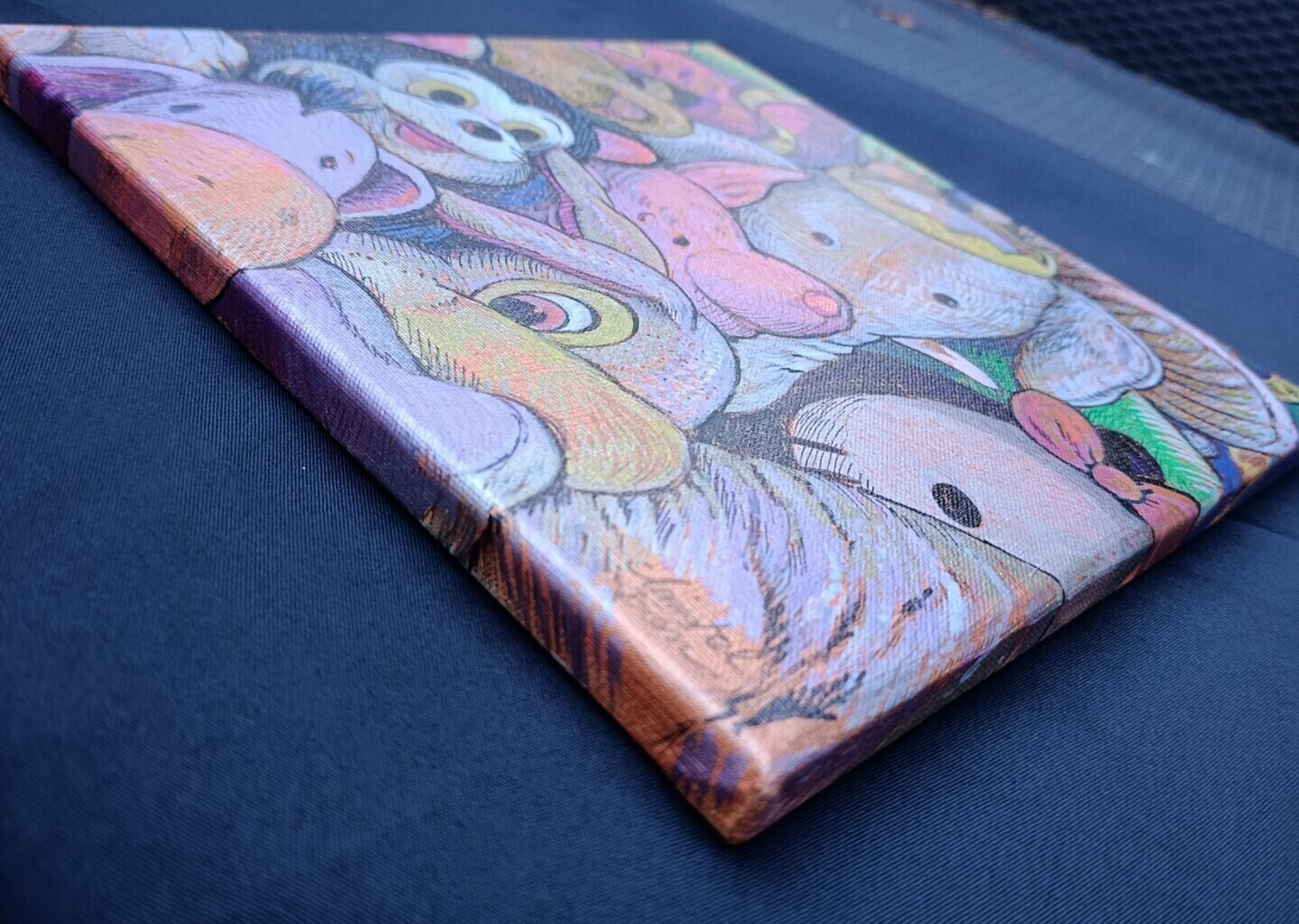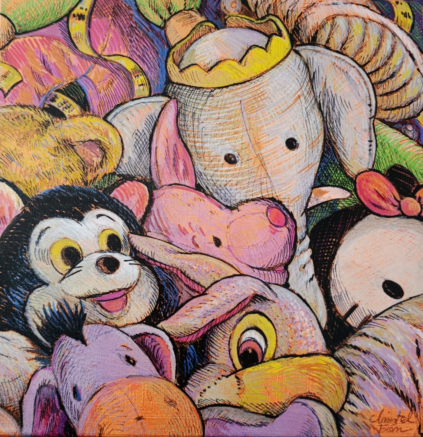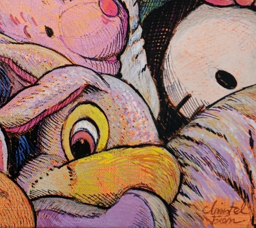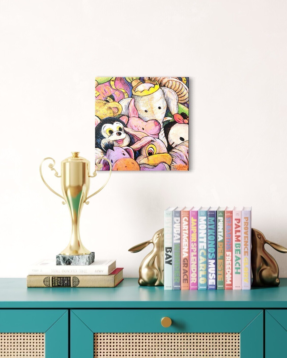 Un joyeux tas de peluches peintes avec des reflets irisés, pour une ambiance de douceur .