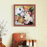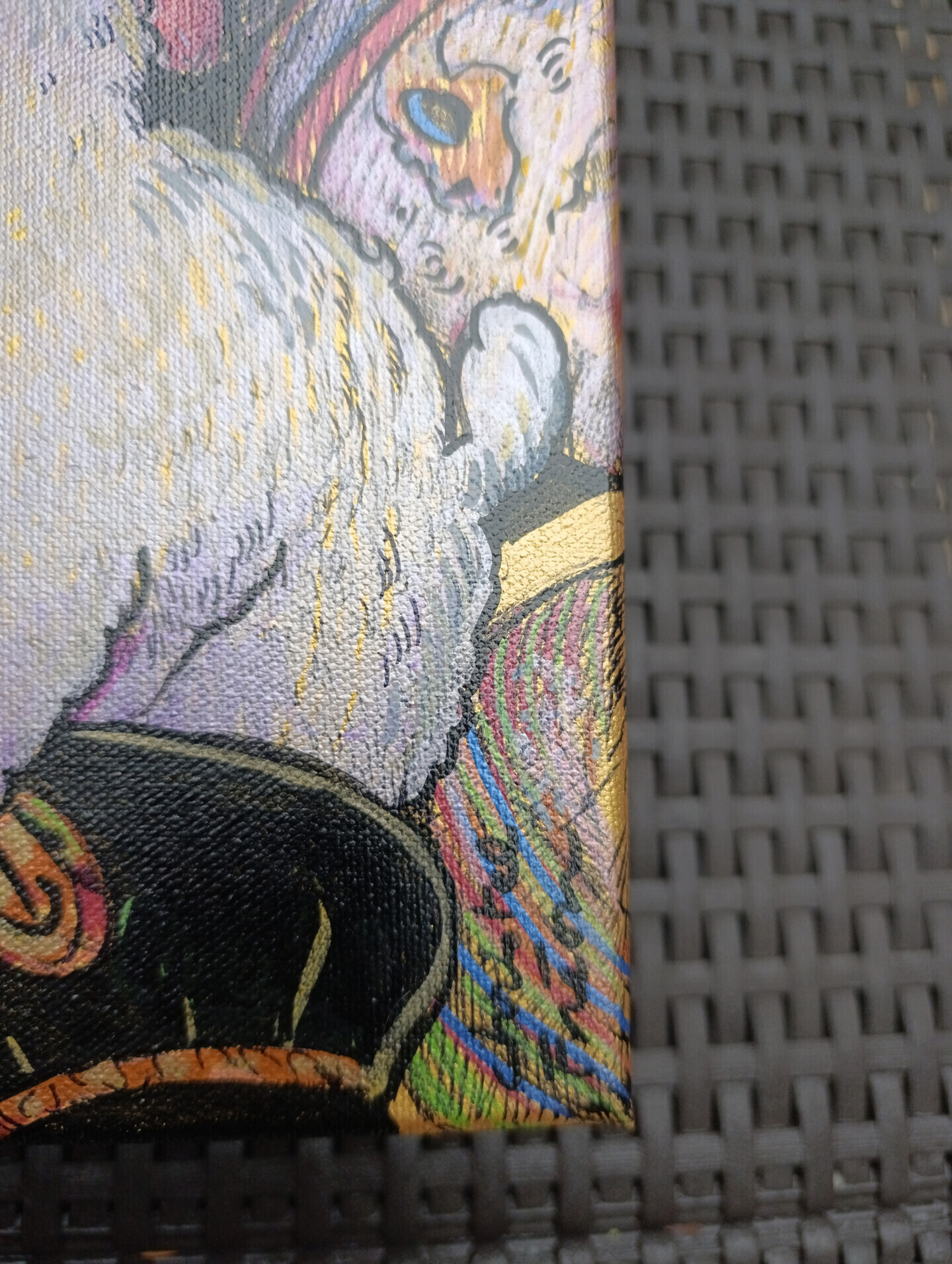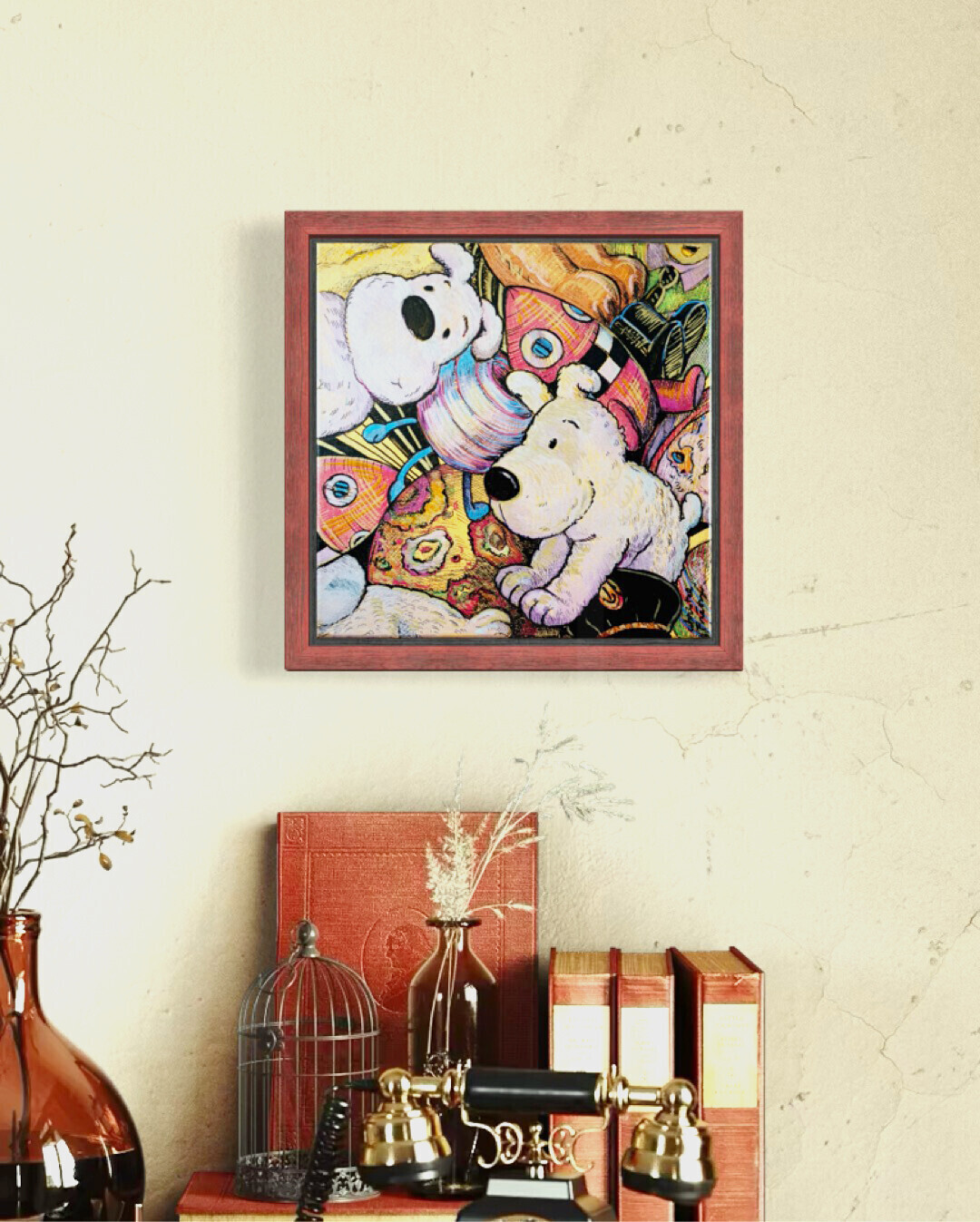 Dans cette oeuvre, j'ai voulu retranscrire la tendresse et la joie enfantine en représentant un personnage bien connu de bande dessiné, dans un style graphique plus moderne par l'utilisation de marqueurs sur un fond métallisé acrylique doré et toujours dans le principe du tas de peluches. Cette oeuvre est prête à accrocher, avec ou sans cadre et ravira les amateurs de Tintin et Milou!